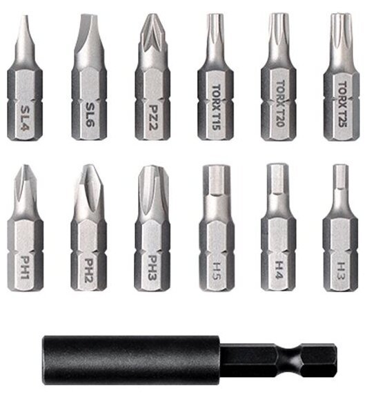 12 комплектных бит к отвертке Mijia выполнены из качественной стали S2 с высочайшей точностью. Они были дополнительно закалены до такой степени, чтобы обеспечивать твердость без растрескивания и упругость без мягкости. С удлинителем на 60 мм отвёртку можно применять в узких и труднодоступных местах для самой разной работы.