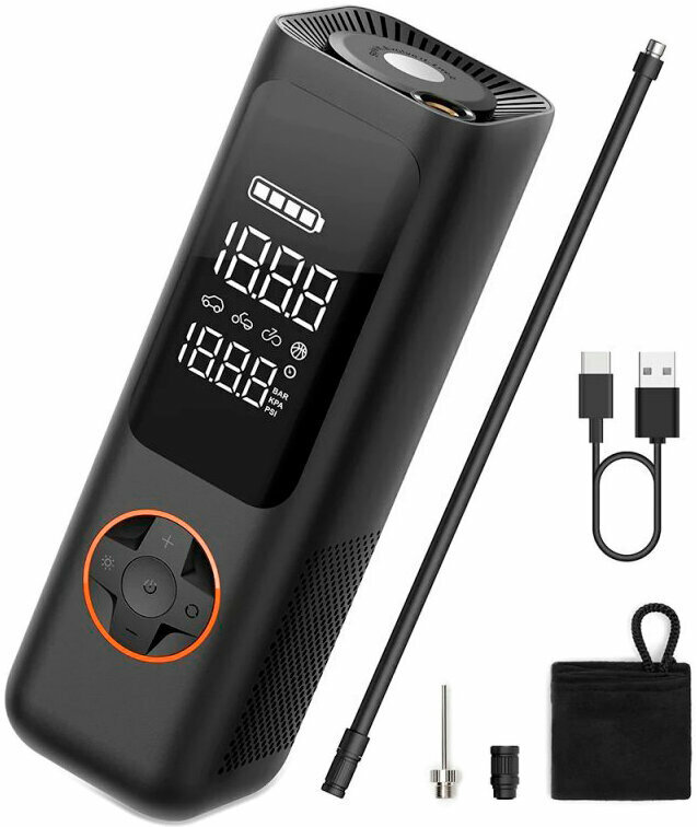 Скорость накачивания 35 л/мин это всего 60 секунд от 2,0 до 2,5 бар для шин R14, а так же менее 5 минут от 0,0 до 2,5 бар. Среднее время для накачивания мяча составляет всего около 20 секунд (значение давления воздуха 8 фунтов на квадратный дюйм), и он может непрерывно наполнять около 86 футбольных мячей при полной зарядке. После достижения заданного давления насос автоматически отключает накачивание, поэтому вам не придётся следить за ним.