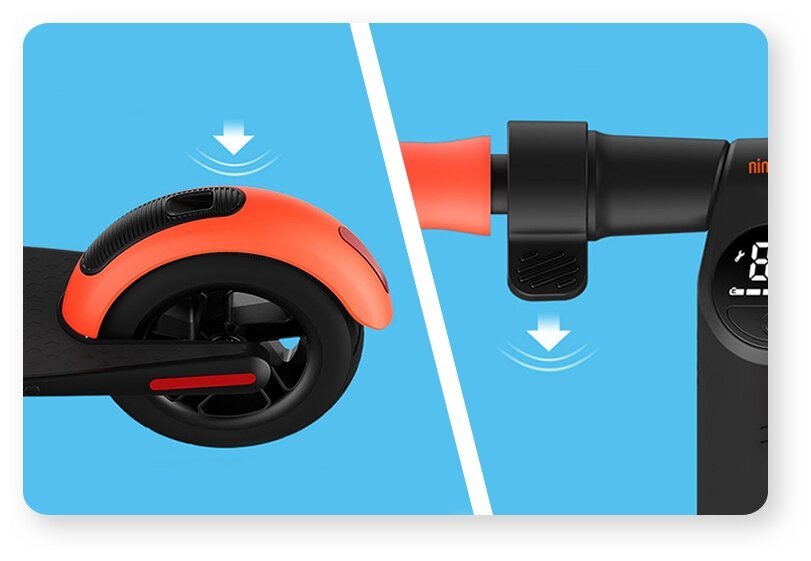 Рама электросамоката выполнена из алюминиевого сплава, который используется в авиации. Порошковая темно-серая краска препятствует образованию коррозии и придает легкую шероховатость покрытию. А яркие оранжевые акценты заряжают позитивом.