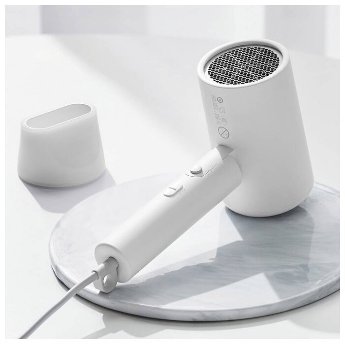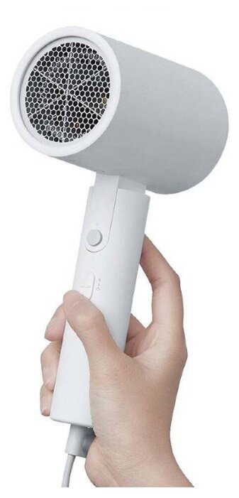 Модель Mijia Negative Ion Hair Dryer выполнена из прочной пластмассы белого цвета с матовой текстурой. Корпус не собирает отпечатки пальцев, не затирается и не пачкается. Ручка оснащена складным механизмом, благодаря чему устройство удобно транспортировать, оно не займет много места. На ней расположены кнопки управления скоростью подачи воздуха и температурой. Сопло закрыто металлической сеткой, чтобы в двигатель случайно не попали посторонние предметы. Вокруг него присутствует магнит, на который крепится насадка. Ее можно вращать на 360 градусов. Сзади также присутствует защитная сетка. Из-за ее уникальной конструкции, в корпус прибора не затягивает волосы.