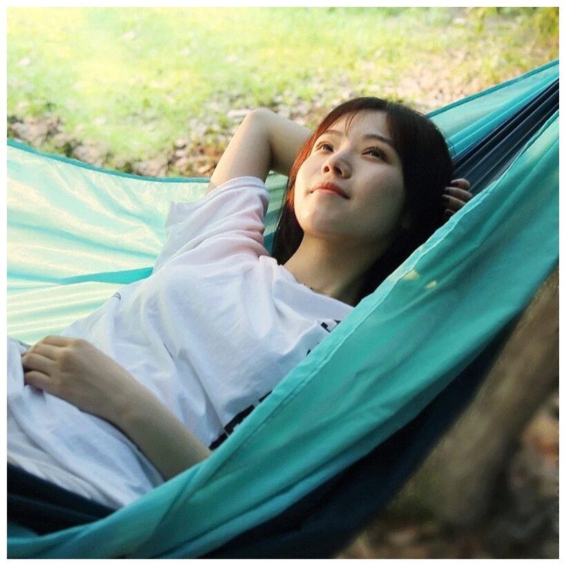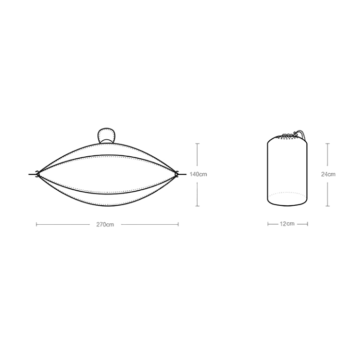 Гамак занимает очень мало места при переносе и весит всего 700 г - его можно без проблем положить в сумку или рюкзак. Кроме того, прямо в гамак вшит чехол для переноски, который