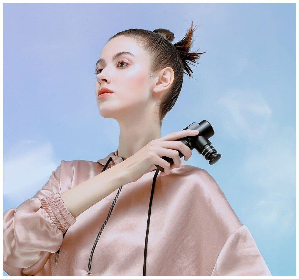 Размер аппарата 140,5 × 82 и весом всего 360 грамм. Такие параметры позволят носить массажер всегда с собой и пользоваться им по мере необходимости. Портативный массажный пистолет, без труда поместится даже в дамской сумочке.