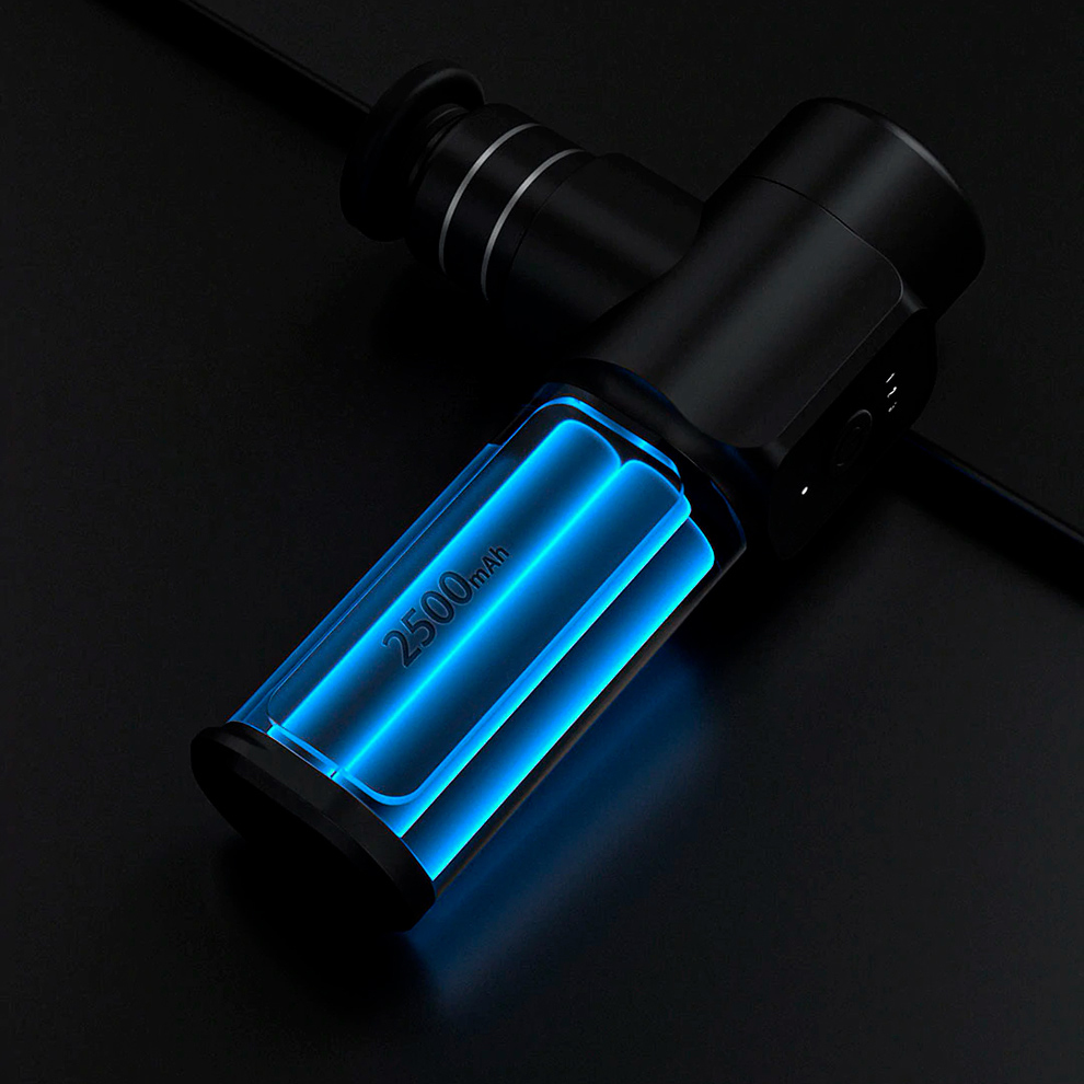 Массажный пистолет оснащен литиевой батареей на 2500 мАч. Если ежедневно использовать гаджет в течение 10 минут, то полного заряда аккумулятора хватит на 90 дней работы без подзарядки.