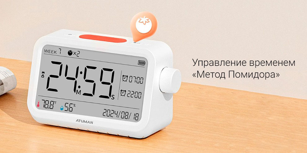 Atuman Duka MT2 объединяет функции будильника, термометра, гигрометра и таймера с «Методом Помидора». Он позволяет установить два будильника и воспользоваться кнопкой «ещё 5 минут» для комфортного пробуждения. ЖК-экран делает управление быстрым и наглядным. Устройство точно измеряет температуру от -9 до +60 градусов и влажность от 10% до 99% с высокой точностью, обновляя данные несколько раз в минуту. Таймер и секундомер помогают планировать работу и отдых, а функция «Метод Помидора» повышает продуктивность. Компактный корпус и аккумулятор 1800 мАч обеспечивают мобильность и длительное время работы без подзарядки.