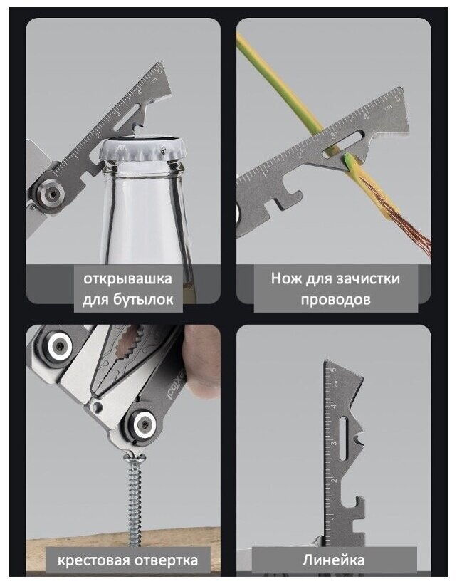Складные плоскогубцы имеют 4 основных инструмента: Острогубцы, стандартные плоскогубцы, плоскогубцы для тонкой проволоки, плоскогубцы для толстой проволоки.