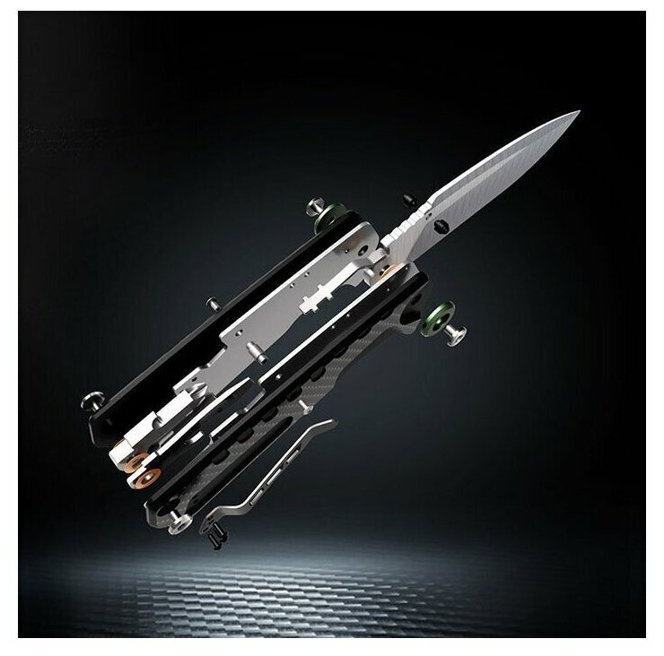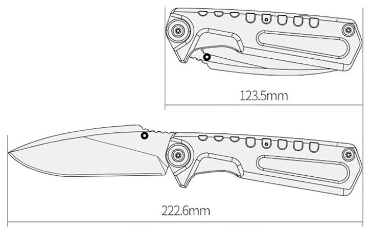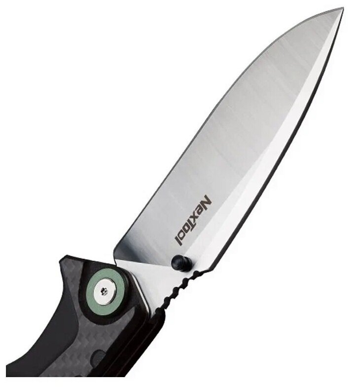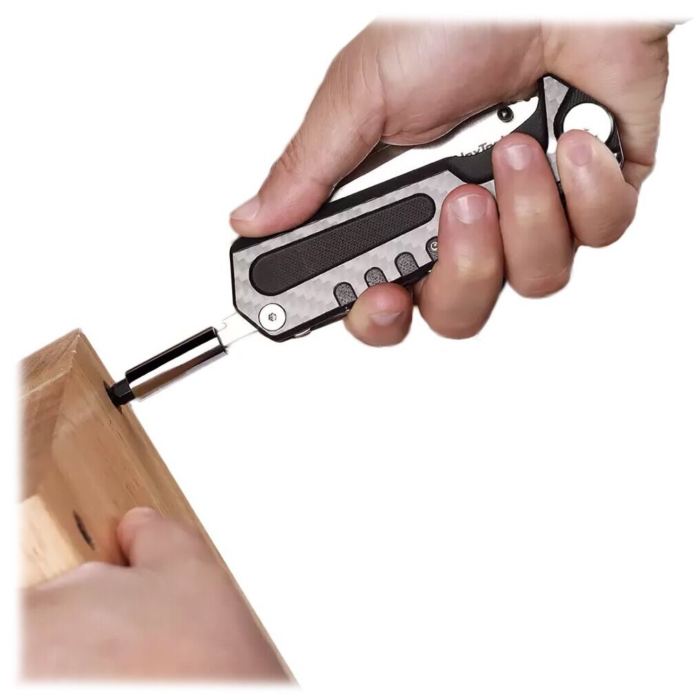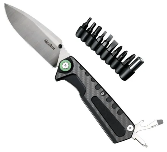 Модель получила широкий и острый клинок, который производится из нержавеющей стали, устойчивый к воздействию влаги. В комплект входит 9 различных бит, что позволяет использовать нож в качестве отвертки. Также предусмотрена открывашка для бутылок. Все элементы надежно фиксируются за счет использования инновационной системы закрытия.