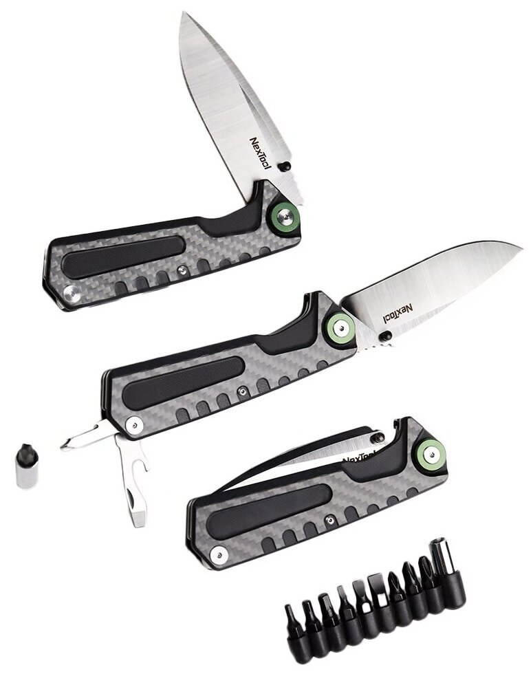 Нож Xiaomi NexTool NE2002 с комплектом из 9 бит. Дополнительны функции: отвертка и открывашка для бутылок. Лезвие из закаленной нержавеющей стали. Надежная система фиксации, эргономичная форма ручки.