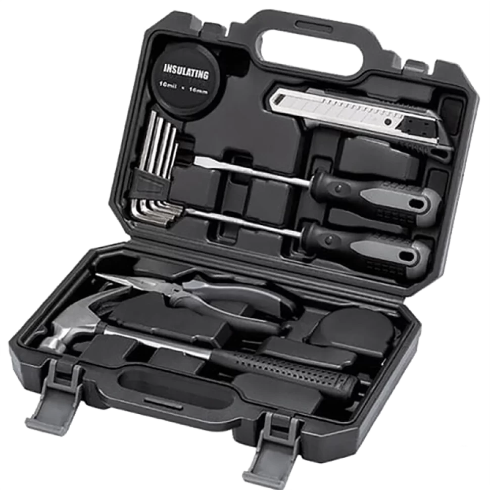 В набор входит: молоток с гвоздодером, рулетка на 3 метра, острогубцы, изолента, строительный нож с выдвижным лезвием, отвертка крестовая, отвертка шлицевая, 5 шестигранных ключей.
