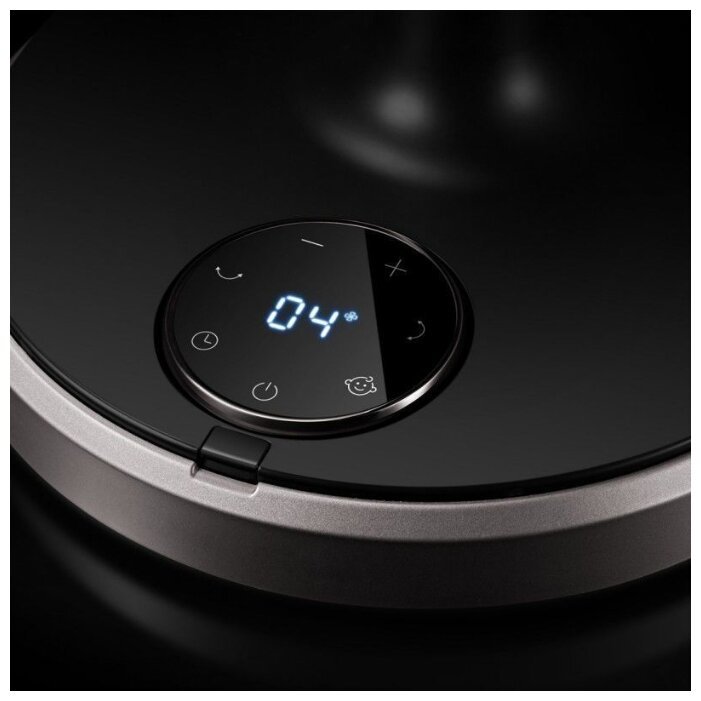 Гаджет имеет удобную ручку для переноски, сенсорную панель управления, возможность регулировки высоты и специальный отсек для хранения пульта. Прибор обладает покрытием из гальванического серебра. Корпус выполнен из качественных материалов.