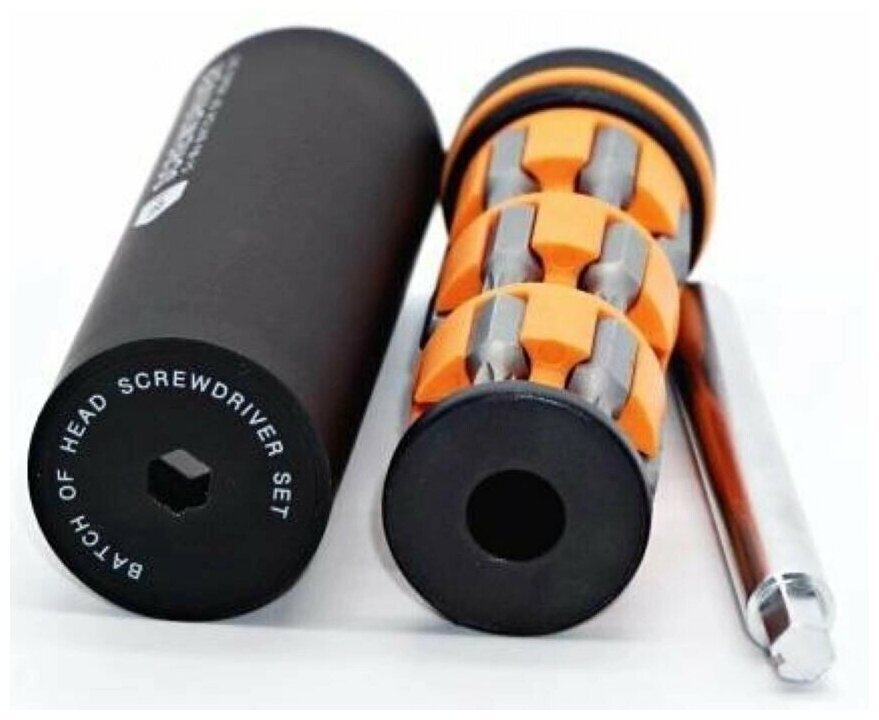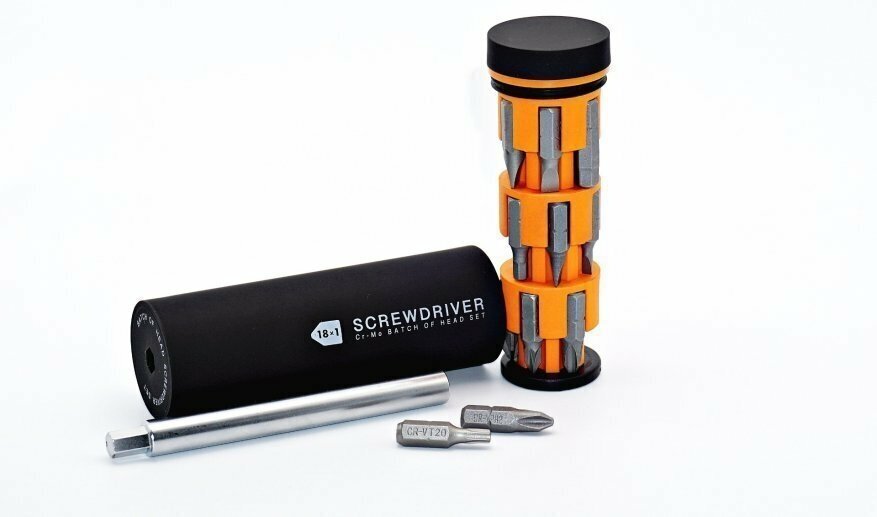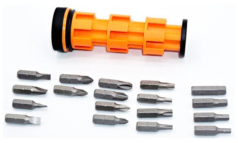 Отвертка поставляется с комплектом из 18 бит, что обеспечивает универсальность ее использования. Биты расположены по кругу в определенном порядке. Инструмент обладает компактным корпусом прочных и качественных материалов, поэтому его можно поместить в карман для быстрого доступа.