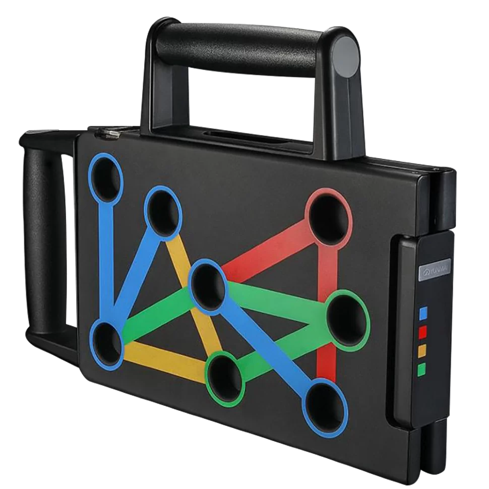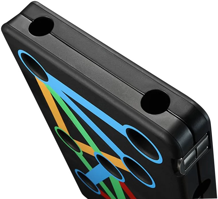 Тренажер состоит из раскладной поверхности, которая имеет 8 отверстий и две удобные съемные ручки. Все отверстия на рабочей поверхности соединены полосами разных цветов. Каждый цвет отвечает за определенную группу мышц. Пользователю остается лишь установить ручки в нужные отверстия и начать тренировку.