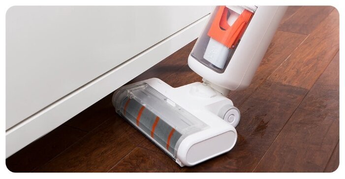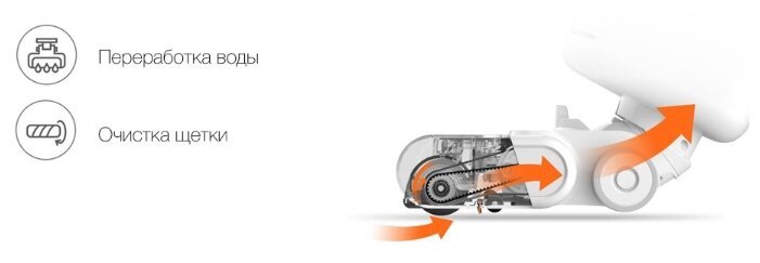 Особая конструкция водопровода внутри пылесоса гарантирует чистоту полов и одновременную очистку щетки. Установленные спереди и сзади скребки улавливают всю собранную с пола грязь, а сама щётка промывается водой в герметичной полости. За счёт высокой скорости вращения и благодаря центробежным силам полы очищаются без разводов и грязи, а щётку не надо отдельно промывать после каждой уборки.