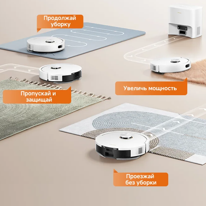 Режим умной чистки ковров обеспечивает тщательное удаление пыли и волос, а настраиваемые параметры позволяют при необходимости объезжать ковры