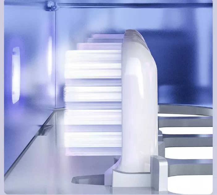 Эффективность стерилизации достигает 99,9%. Дезинфекция осуществляется за счет воздействия на зубные щетки волны длиной 275 нм, которая разрушает ДНК бактерий, предотвращая их размножение. Отражающий эффект внутренней зеркальной камеры обеспечивает стерилизацию на 360°