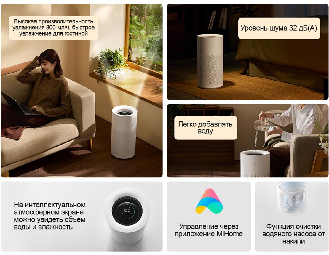 Цифровой дисплей с большим экраном показывает уровень увлажненности в реальном времени, а кольцевой индикатор показывает уровень комфортной влажности. Также на экране загорается предупреждение о нехватке воды.